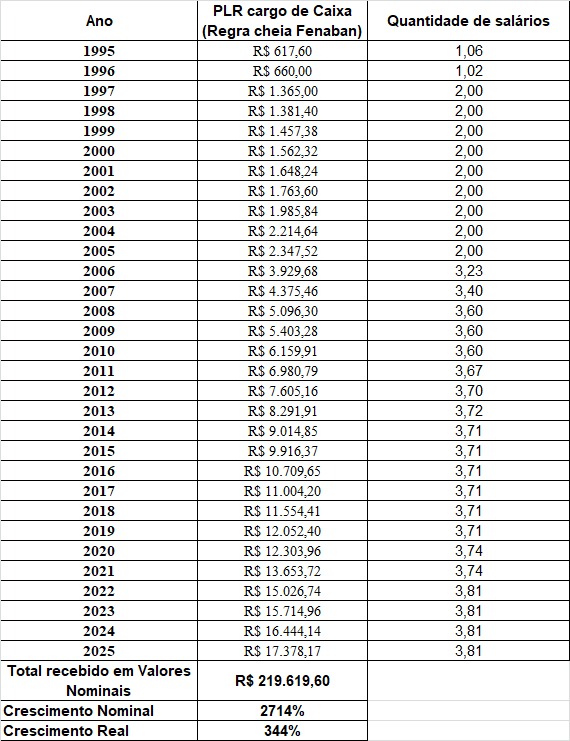 Isso equivale a dizer, somente a título de ilustração, que um bancário hipotético, recebendo piso de caixa nos últimos 30 anos, garantiu desde 1995 o montante total de PLR, em termos nominais, correspondente a R$ 219.619,60.